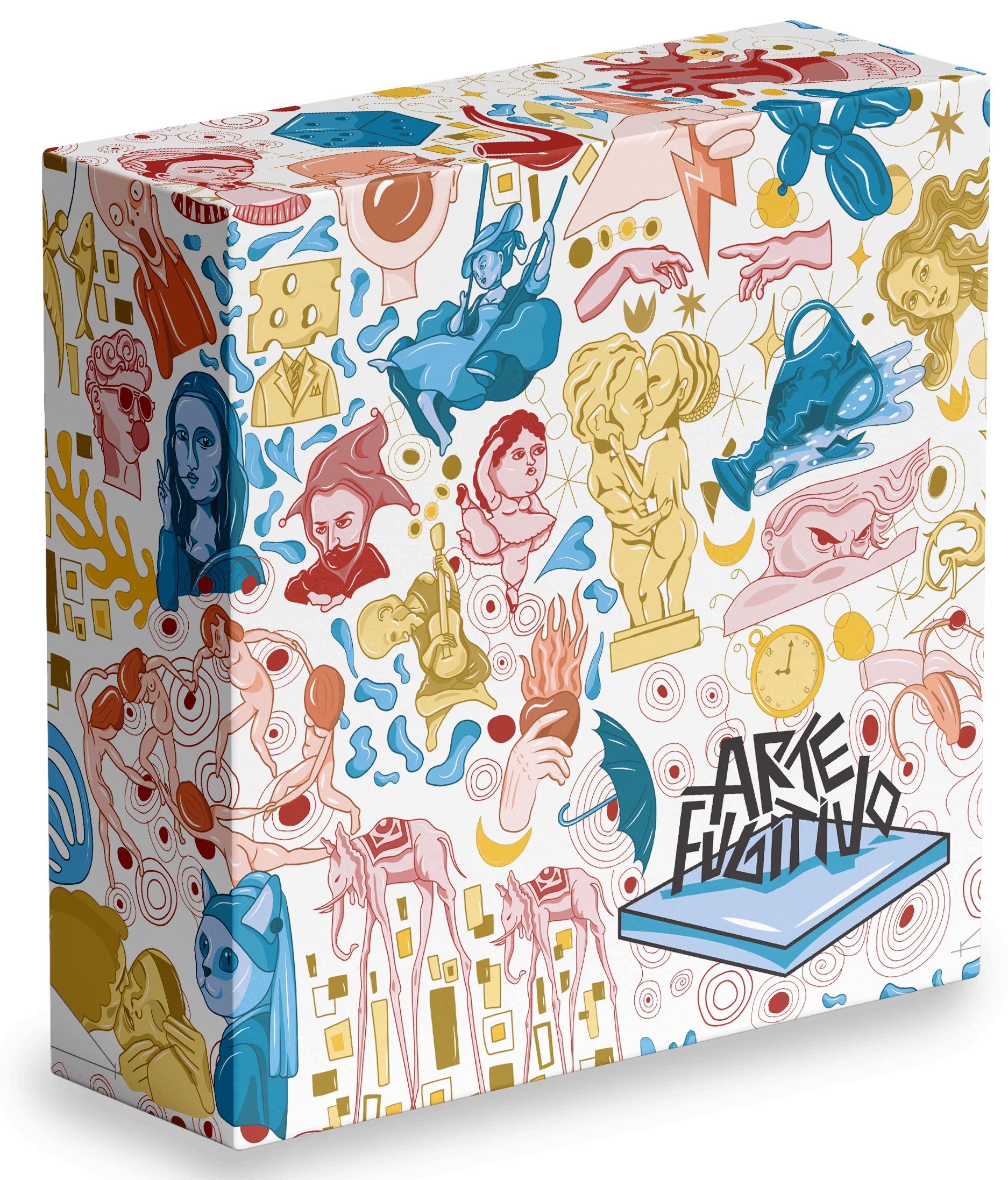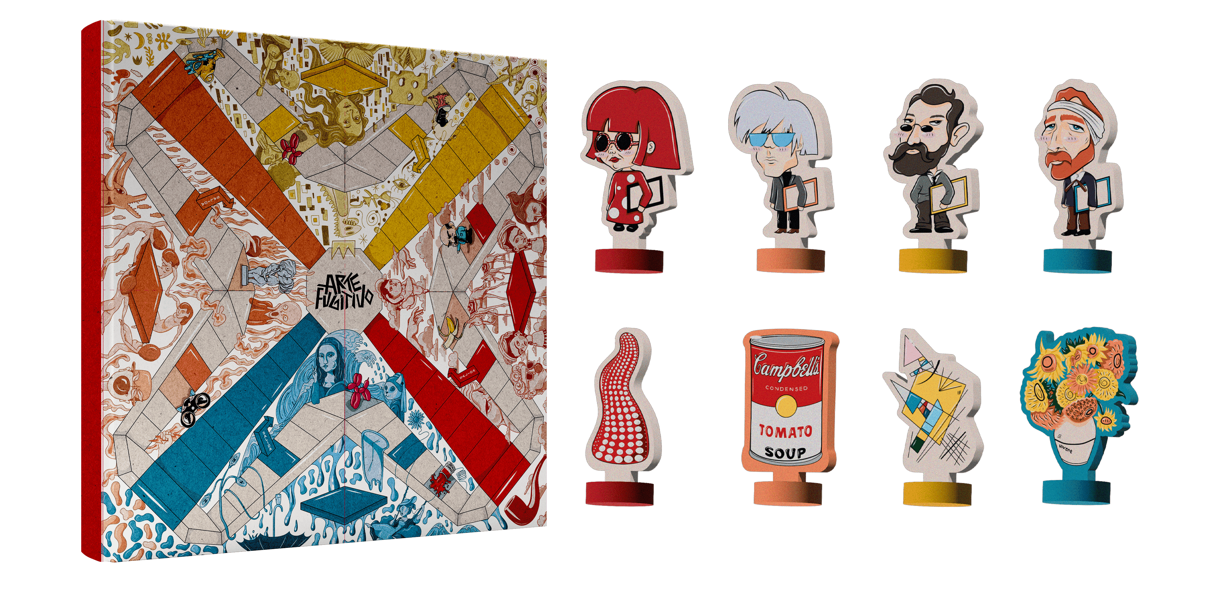 Arte Fugitivo es un parqués ilustrado que fusiona el arte con el juego, reimaginando algunas de las obras más reconocidas de la historia desde una mirada gráfica y divertida. Cada base representa a un artista emblemático —Andy Warhol, Vasili Kandinski, Vincent Van Gogh y Yayoi Kusama— cuyas estéticas inspiran tanto las fichas como los elementos visuales del tablero.