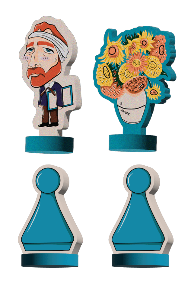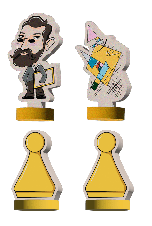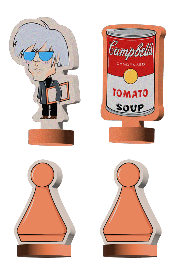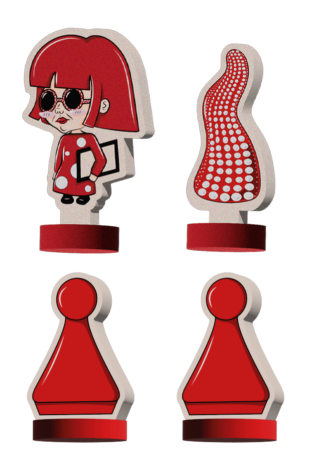 Cada base del parqués cuenta con fichas inspiradas en los artistas Andy Warhol, Vasili Kandinski, Vincent Van Gogh y Yayoi Kusama. Incluyen reinterpretaciones de sus obras más representativas y se complementan con dos piezas adicionales por base, completando así las cuatro fichas tradicionales del juego.