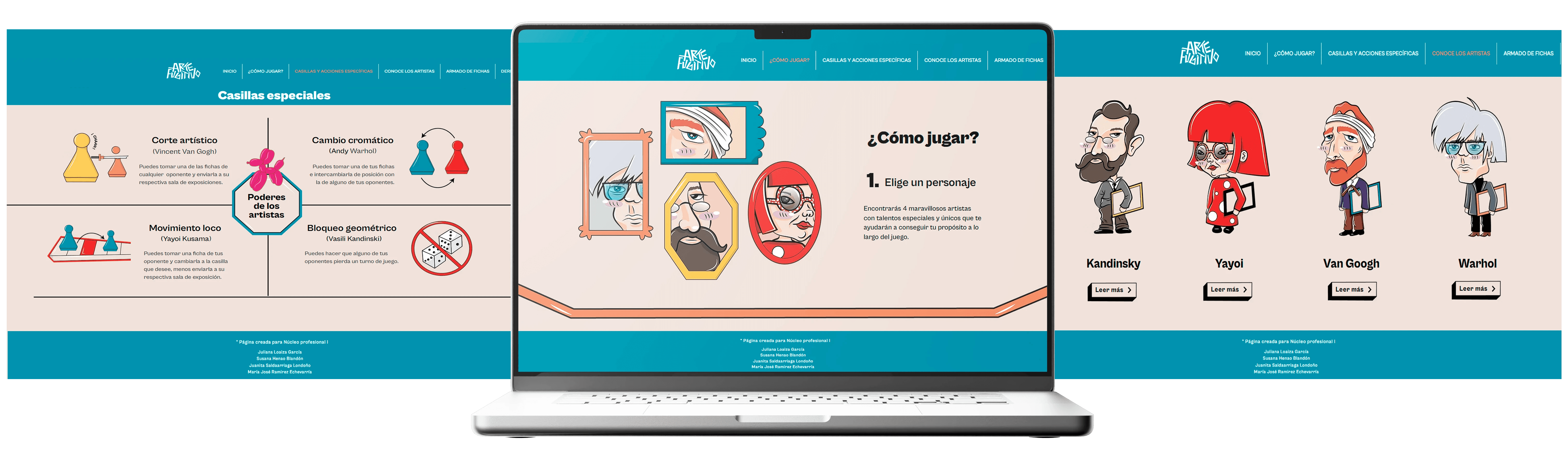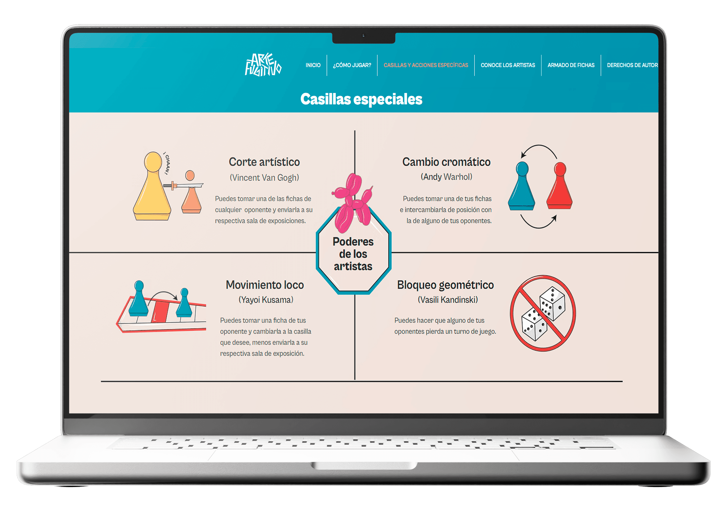 La página web de Arte Fugitivo funciona como una guía interactiva del juego. Allí los usuarios pueden conocer las reglas, explorar las fichas, entender el objetivo y familiarizarse con las casillas especiales.