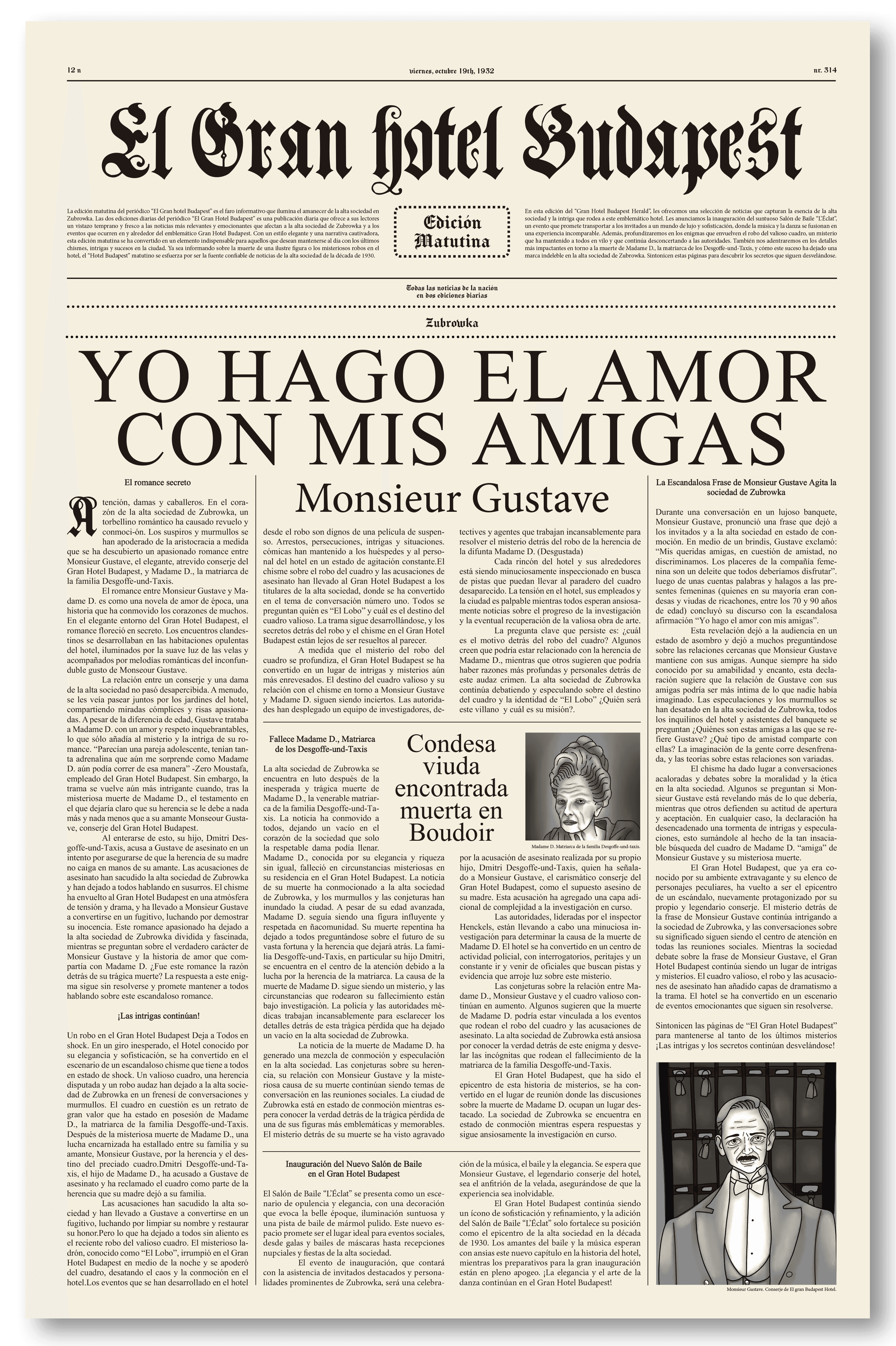 Cuaderno 3: Una reinterpretación de la portada del periódico ficticio, con titulares que mezclan los chismes, la muerte de Madame D. y el humor característico del filme.