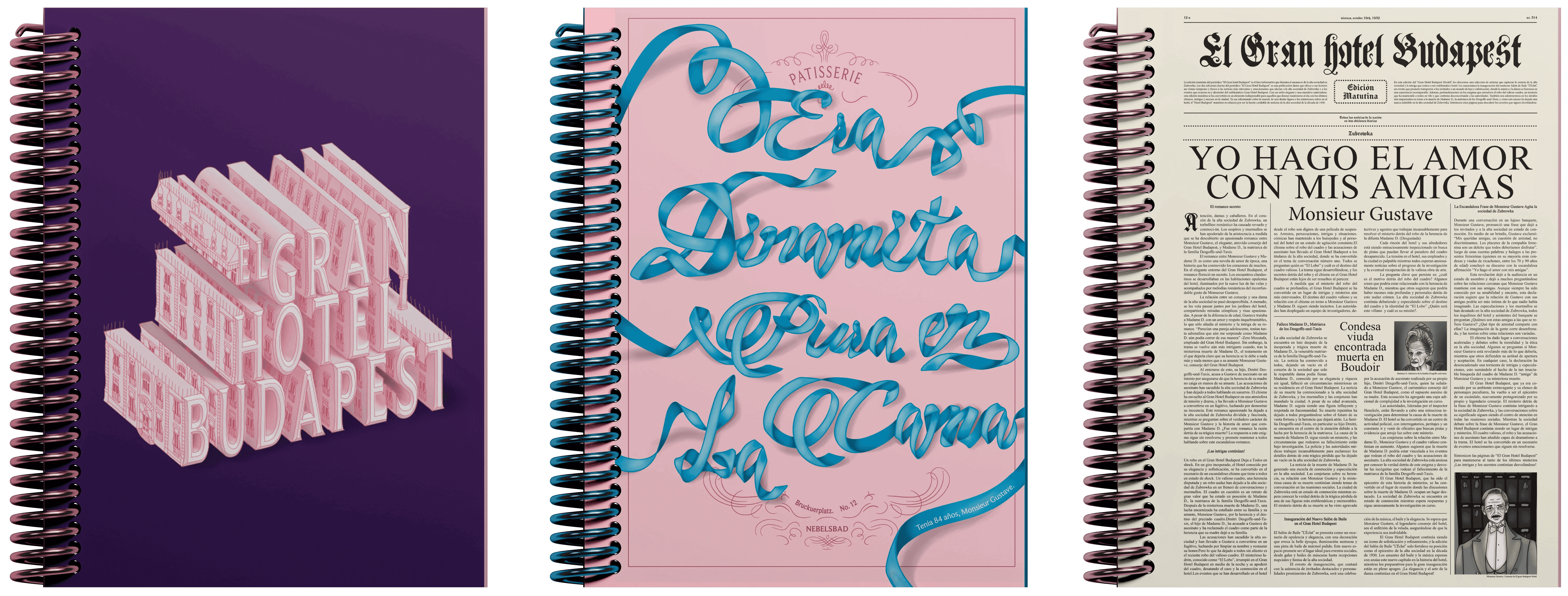 Cuaderno 2: La icónica caja de Mendl’s cobra vida; su cinta azul se transforma, al plegarse, en la frase de Monsieur Gustave: “Era dinamita pura en la cama”.