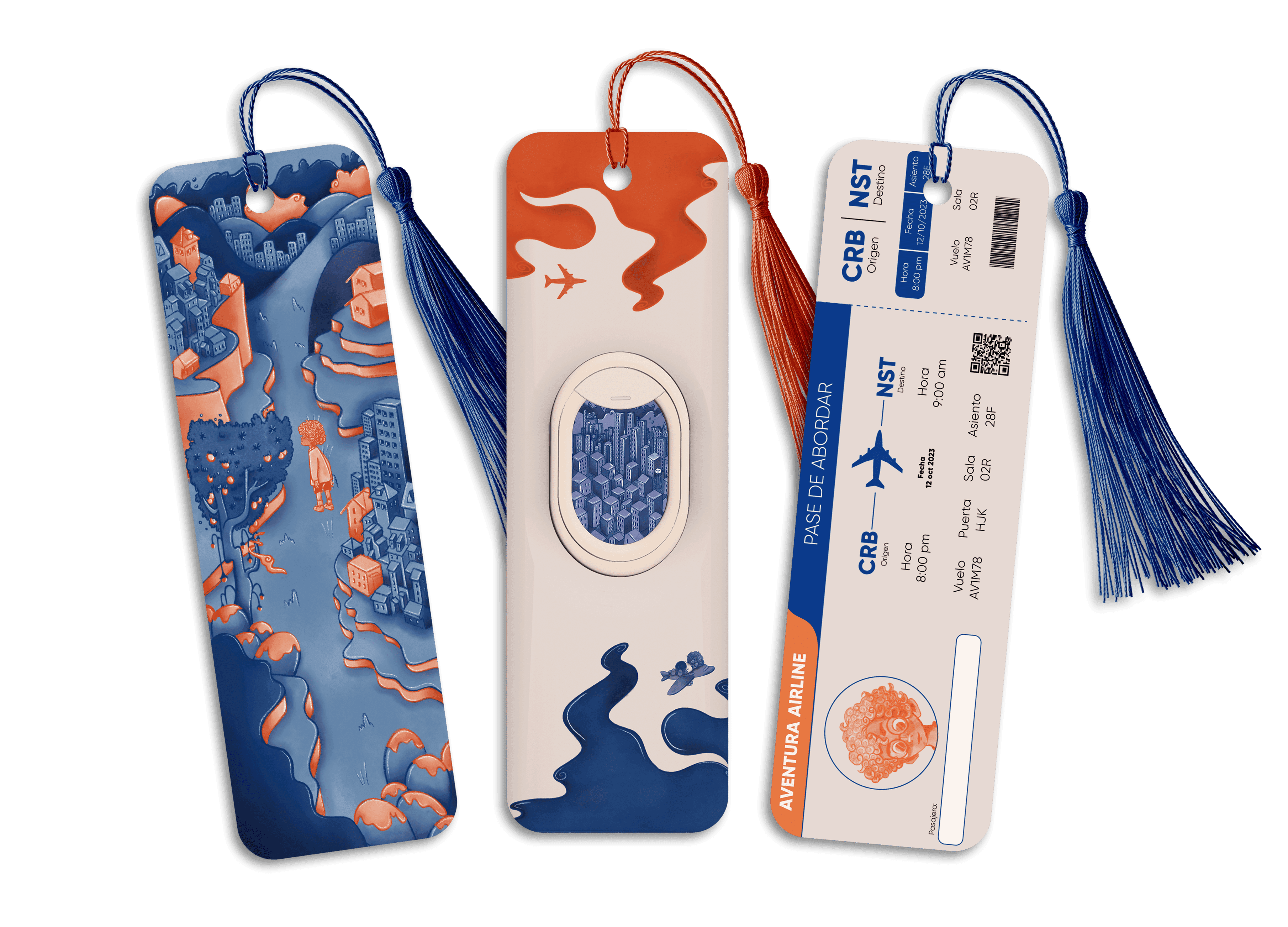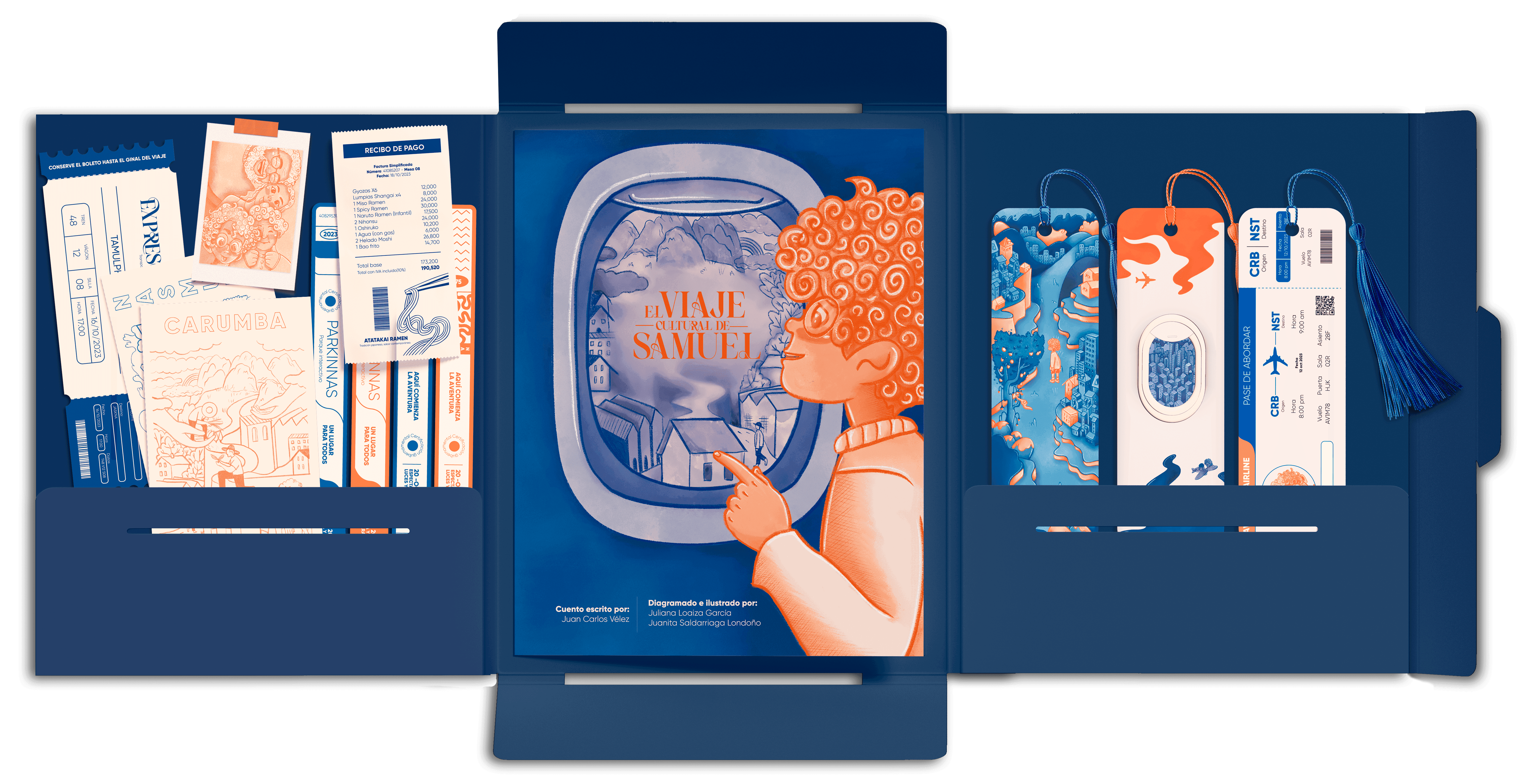 El proyecto incluye un fólder que contiene el cuento plegable, tres separadores ilustrados y los recuerdos que Samuel trae de su viaje, conformando un kit que celebra el aprendizaje y la memoria cultural.