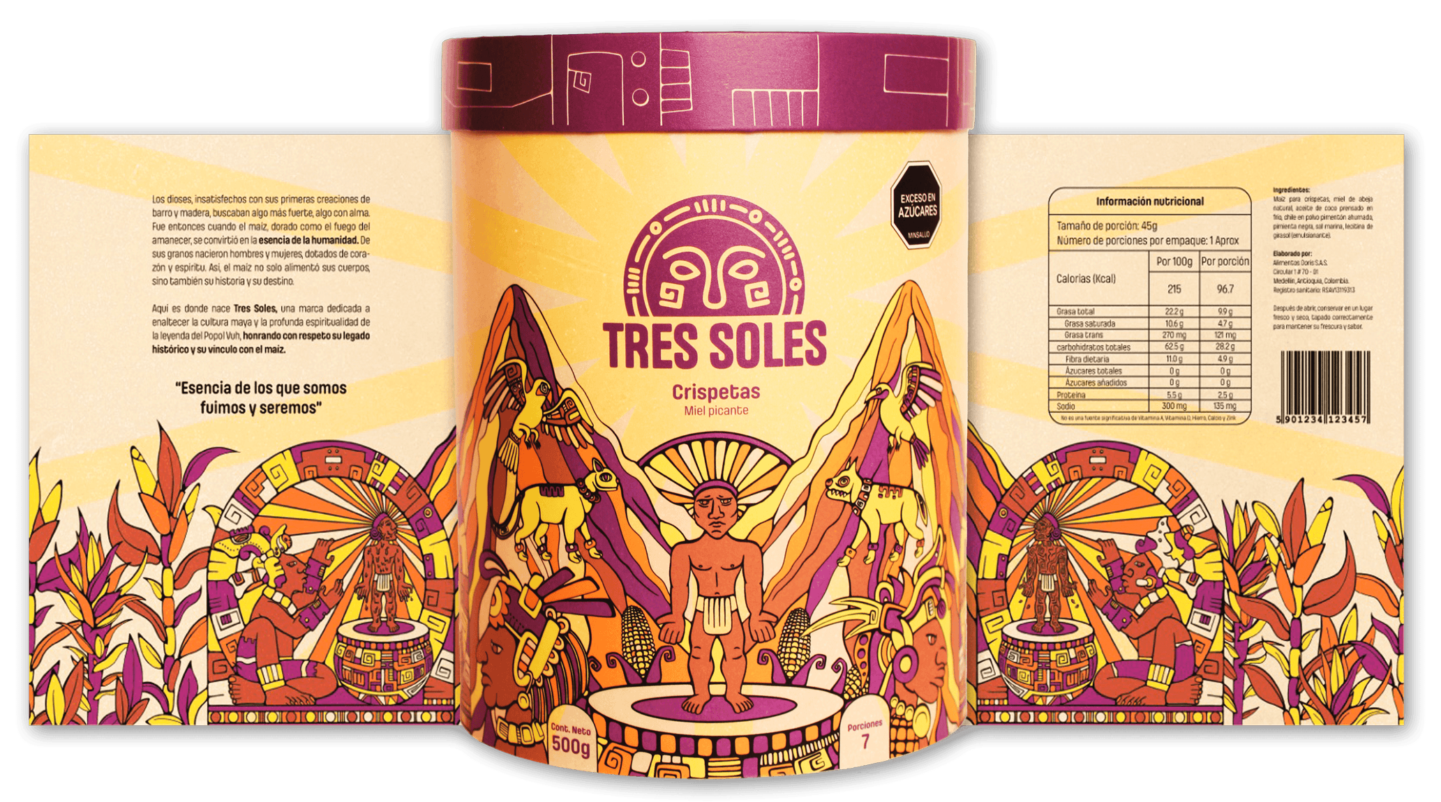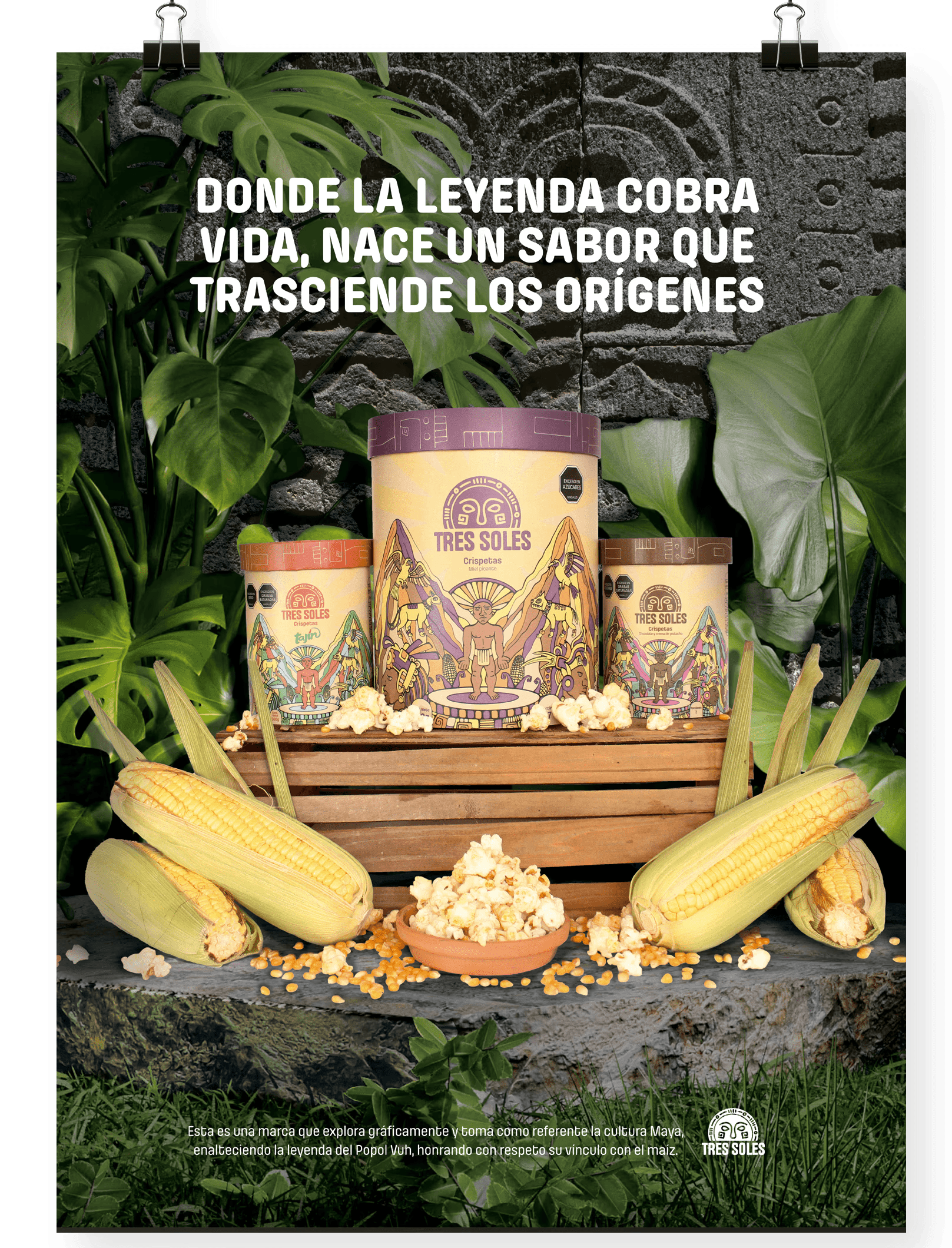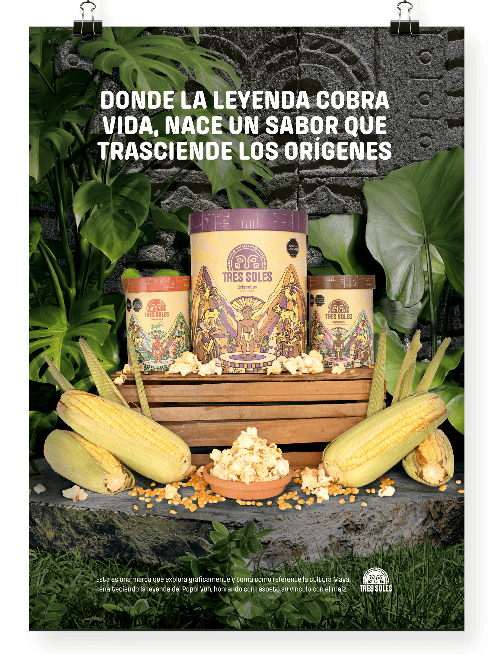 Tres Soles es una marca de crispetas premium inspirada en la mitología maya, donde el ser humano fue creado a partir del maíz. Cada empaque celebra el origen sagrado del maíz, convirtiendo cada bocado en una experiencia ancestral, intensa y contemporánea.