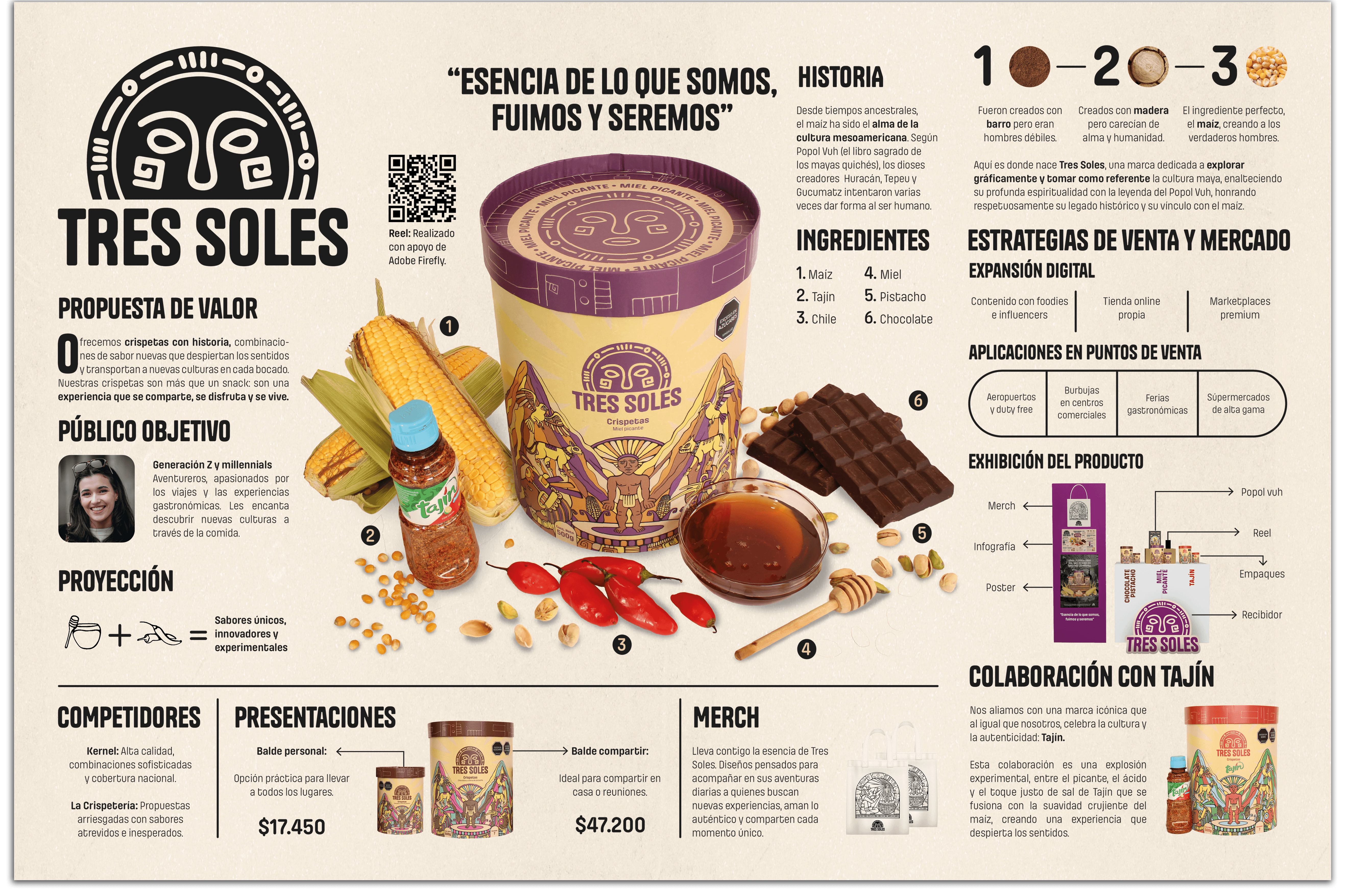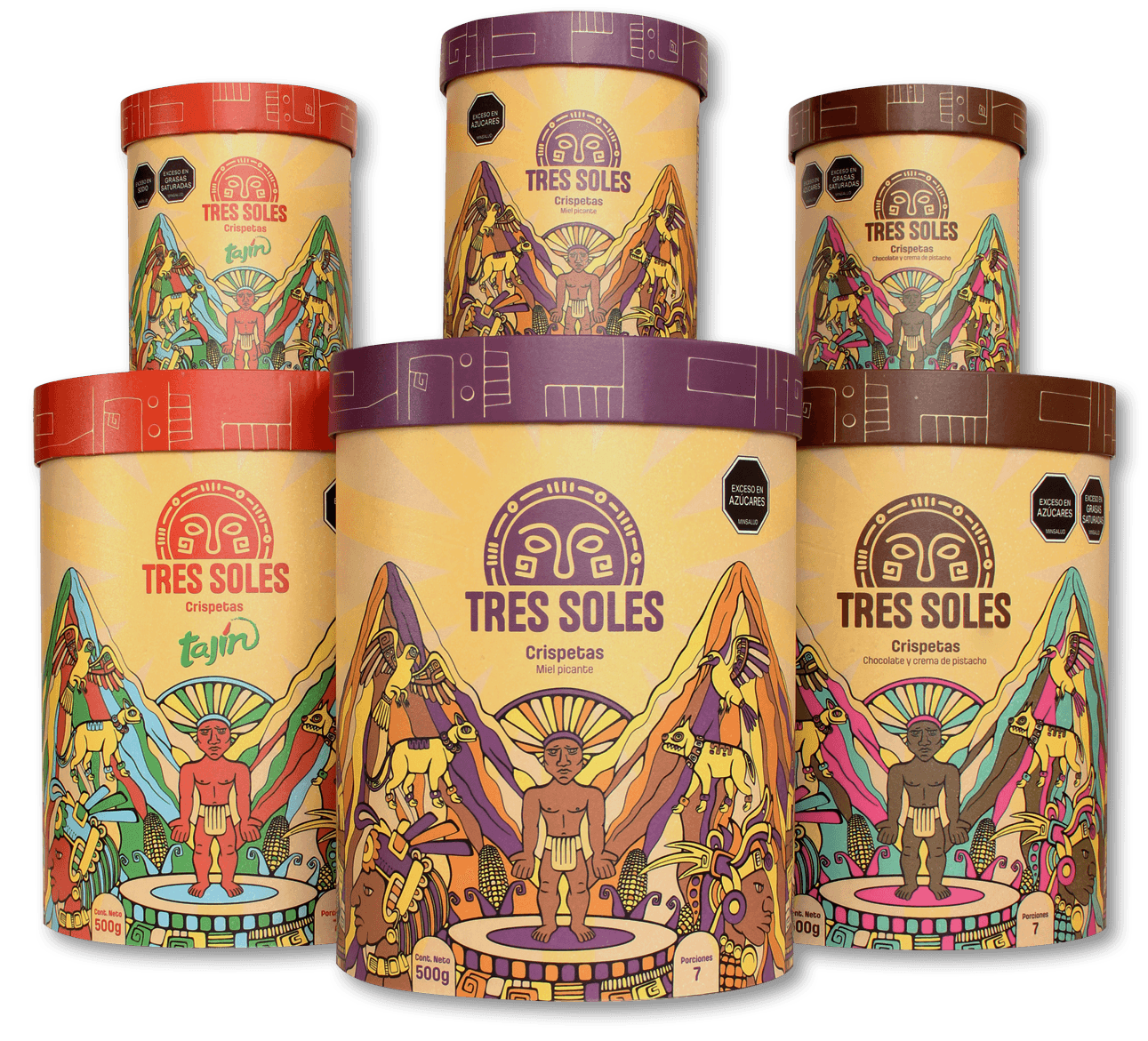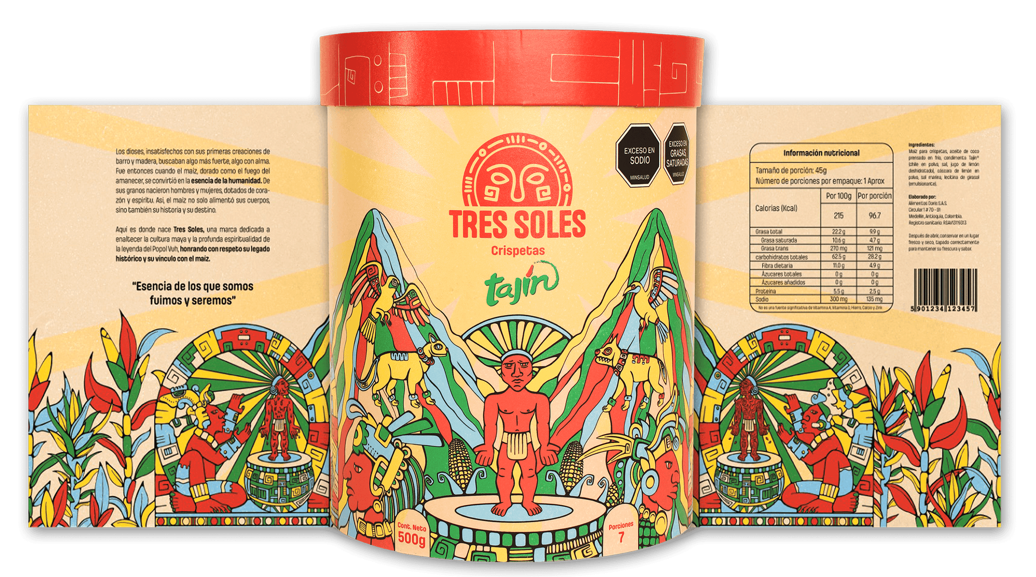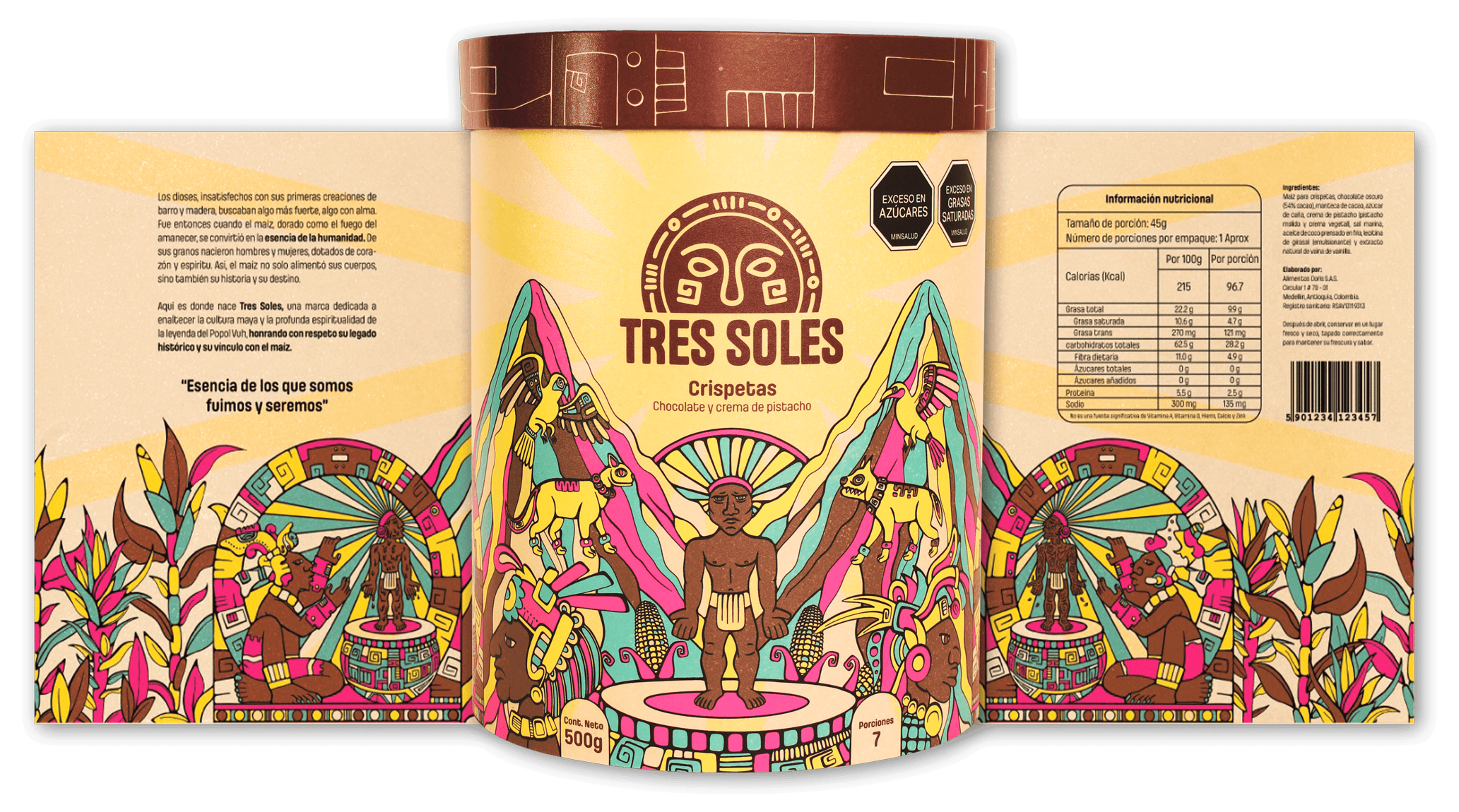 Tres Soles es una marca de crispetas premium inspirada en la mitología maya, donde el ser humano fue creado a partir del maíz. Cada empaque celebra el origen sagrado del maíz, convirtiendo cada bocado en una experiencia ancestral, intensa y contemporánea.