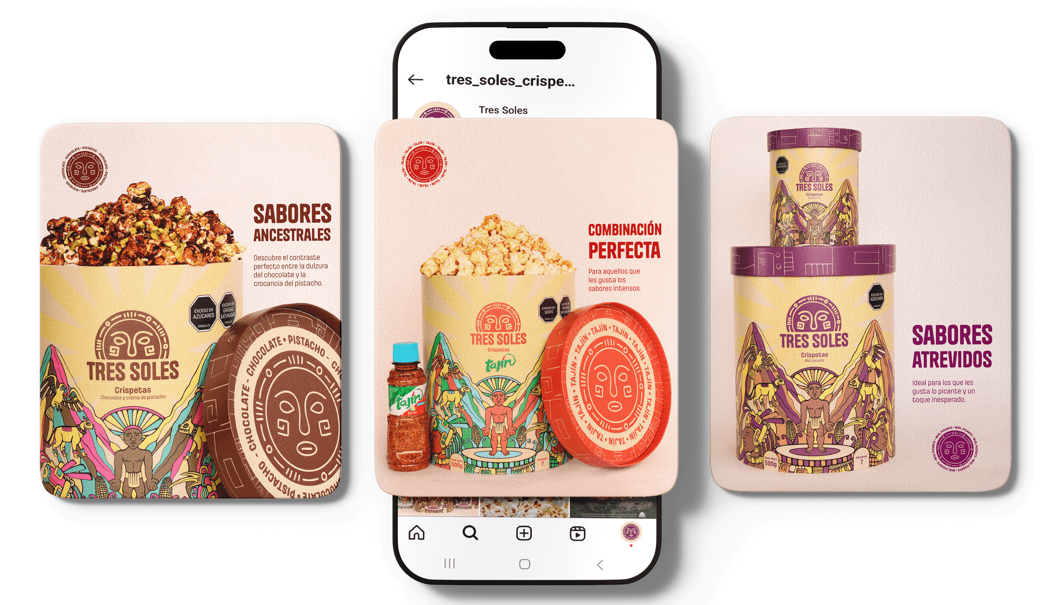 El Instagram de Tres Soles es una vitrina visual donde, a través de reels, ilustraciones, colaboraciones y relatos breves, la marca comunica su identidad con un lenguaje gráfico que enaltece la cultura maya y su profunda conexión con el maíz.